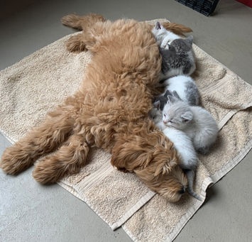 Millie and Max have been with us since they were puppies. They are both Medium F1b Golden Doodles (75% Poodle 25% Golden Retriever) which means their puppies have the best traits and qualities of both breeds. These puppies will grow to be between 14-21 inches tall and weigh between 35-40lbs. Their fur will be thick and curly although their coat will vary from dog to dog. They are hypoallergenic and are the best generation for allergy sufferers since they are the least shedding of fur and dander. Golden Doodles are peaceful, intelligent, easy to train, and don't tend to bark often like other breeds.